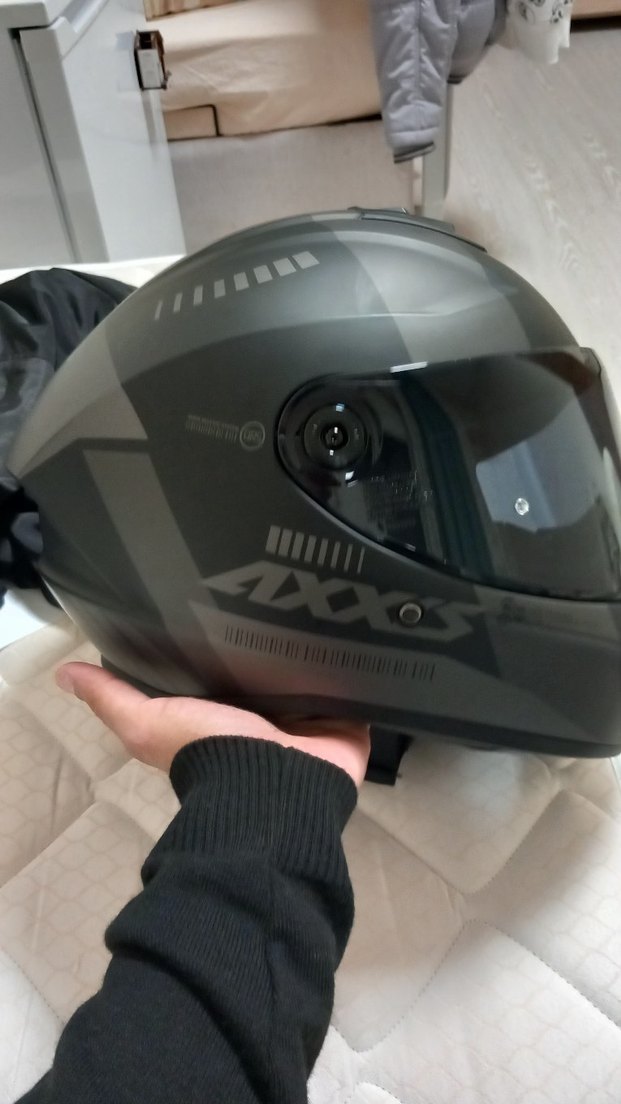 Siyah ve gri renkte, baskılı desenli ve kilitli tokalı AXXS motosiklet kaskı. Plastik malzemeden üretilmiş, rock punk tarzına uygun. ️malesef beden büyük geldi o yüzden satıyorum xl