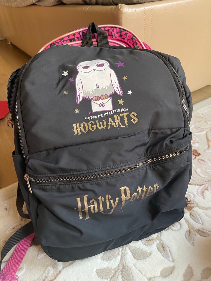Kilitli kayışlara sahip siyah sırt çantası, sentetik kumaştan üretilmiş ve gothic ile rock punk tarzını yansıtıyor. Harry Potter temalı yazı ve baykuş baskısı bulunur.