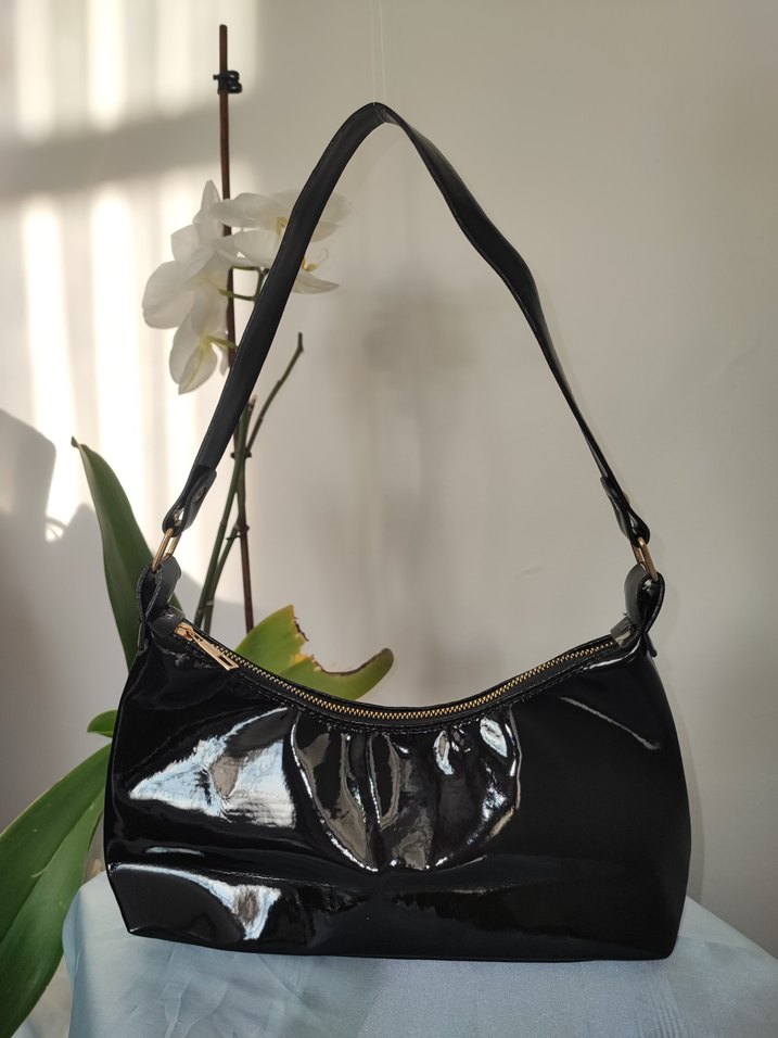 Kilitli askısı ve fermuarlı kapanışı olan siyah parlak deri kadın çanta, günlük kullanıma uygun cesur gotik tarzda.