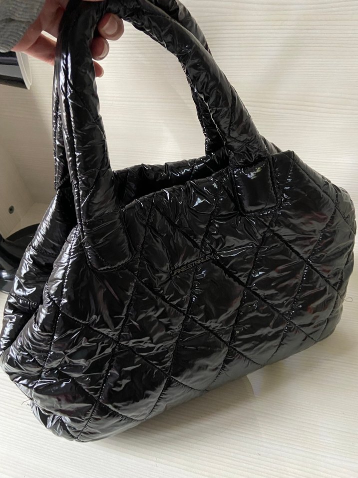 Kilitli saplı, parlak siyah, kapitone dokulu çanta. Karanlık goth tarzıyla günlük kullanıma uygun.