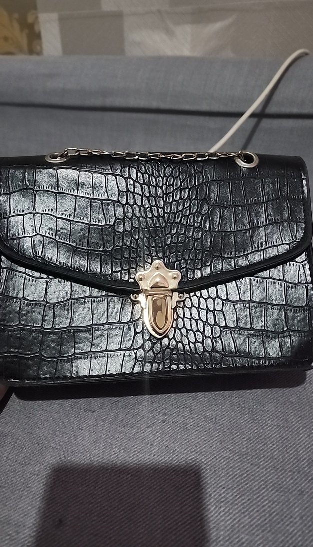 Siyah yılan derisi desenli deri çanta, kilitli tokasıyla modern klasik tarzda, Paris esintili günlük kullanım için uygun.