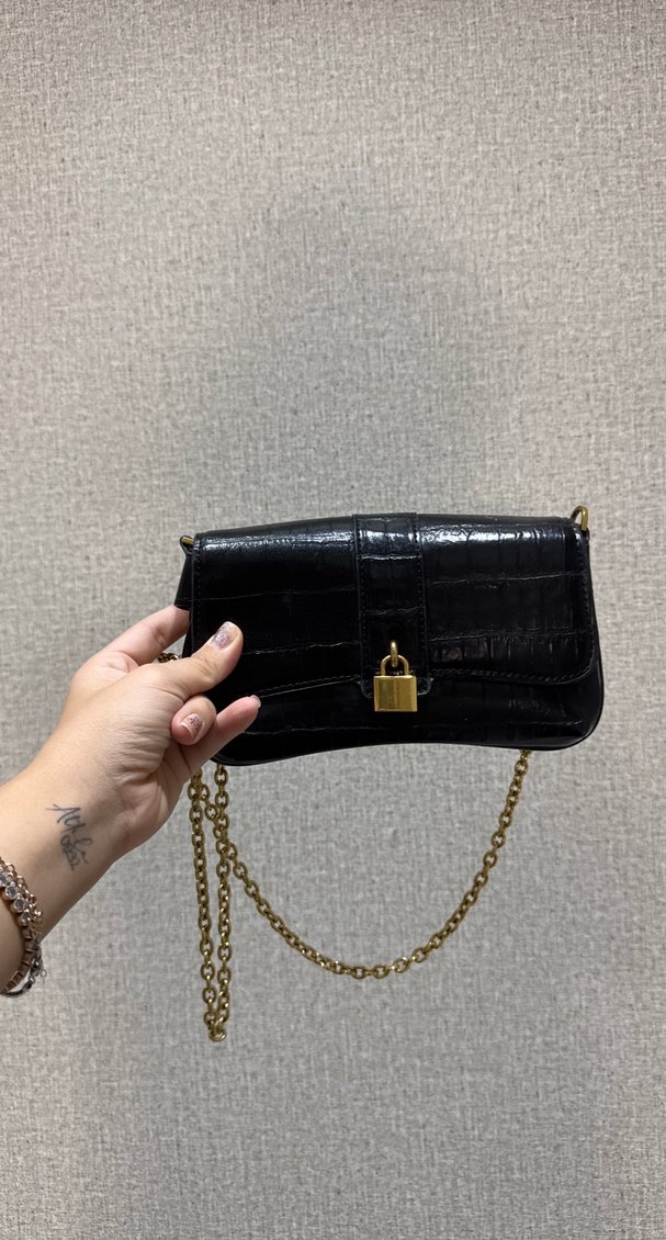 Siyah yılan derisi desenli deri çanta, önünde kilitli tokası ve altın zincir askısıyla klasik şıklığı sokak stiline taşıyor. Günlük kullanıma uygun.