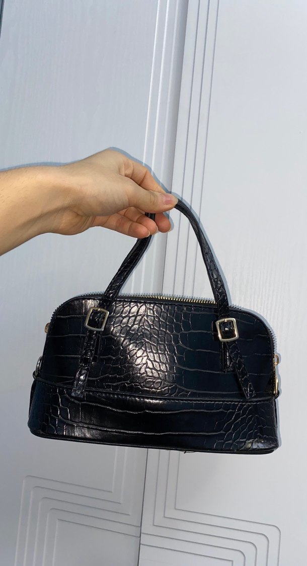 Siyah yılan derisi desenli, tokalı saplara sahip kadın çantası. Deri malzemeden üretilmiş, cesur Paris sokak stili için uygun, günlük kullanıma uygun.