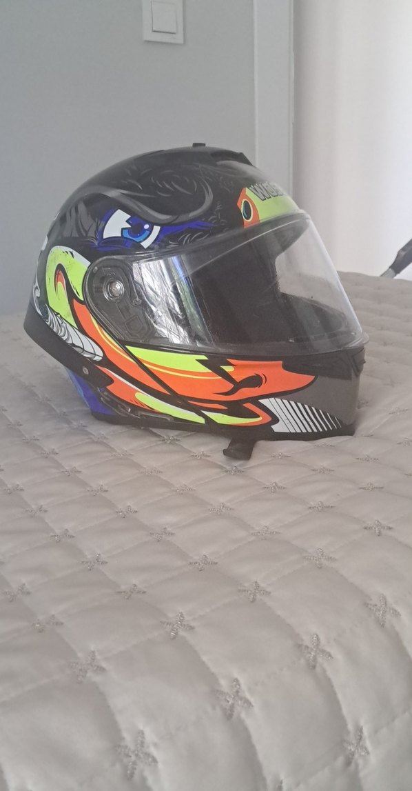 Bu biker kask, dayanıklı plastikten yapılmış, kilitli tokalı ve çok renkli baskılı tasarıma sahiptir. Avant-garde tarzı ve rock punk havası taşır. ️
