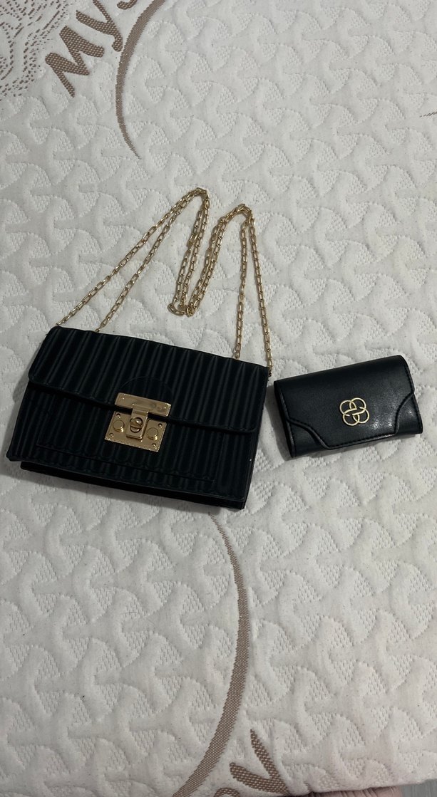 Siyah deri kadın çanta, kilitli kapak ve zincir askıya sahiptir. Baskılı deseni ve uyumlu küçük cüzdanıyla günlük sokak stiline klasik bir dokunuş katıyor.