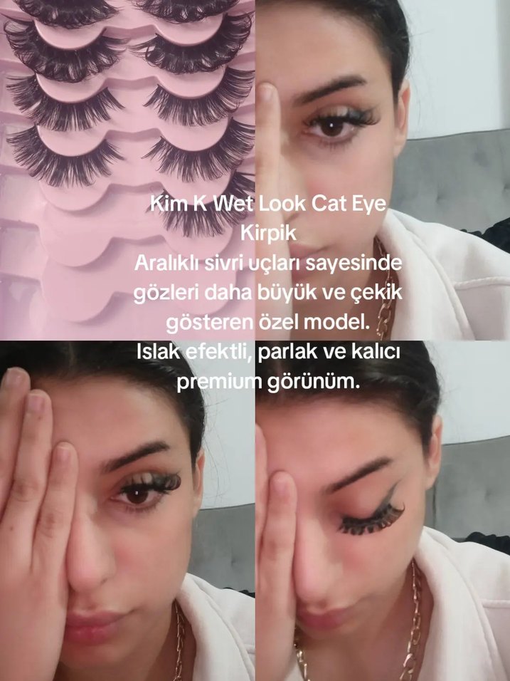 takma kirpikler, aralıklı sivri uçları sayesinde gözleri daha büyük ve çekik gösterir. Islak görünümlü, parlak ve kalıcı, premium bir görünüm sunar. yanında kirpik tarayıcısı ile birlikte gönderim sağlanır