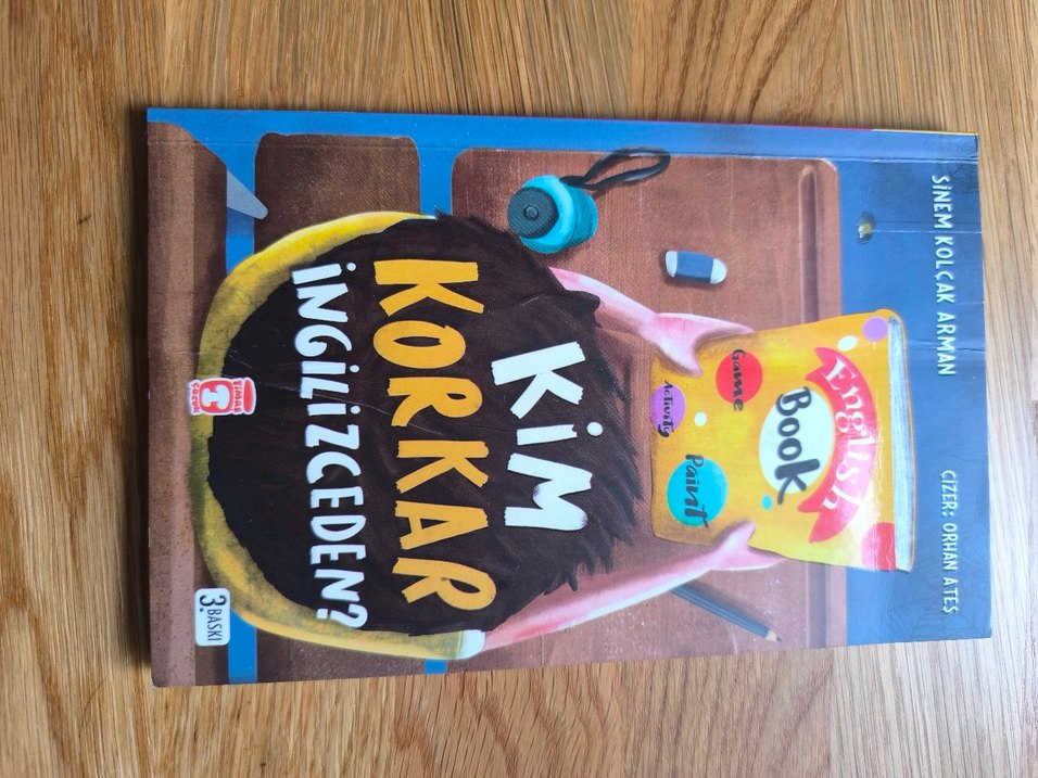 Renkli kapaklı, eğlenceli çizimlere sahip "Kim Korkar İngilizceden?" adlı çocuk mizah kitabı. 3, 4 sınıf seviyesi