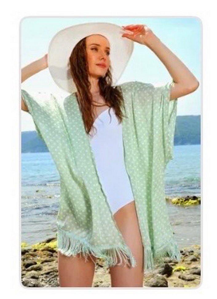 Bohem tarzı, püsküllü ve kısa kollu, bol kesim mini pareo, plaj için ideal, pastel renklerde.
