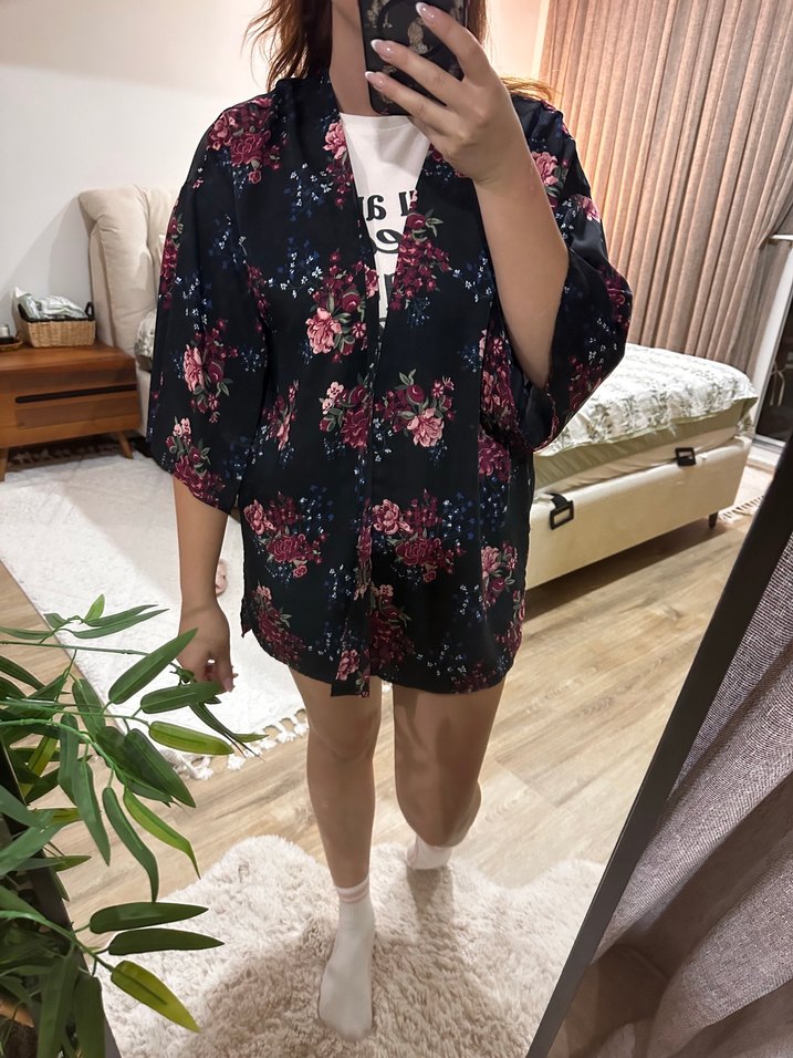 Koyu renkli çiçek desenli, kısa kollu kimono sıfır