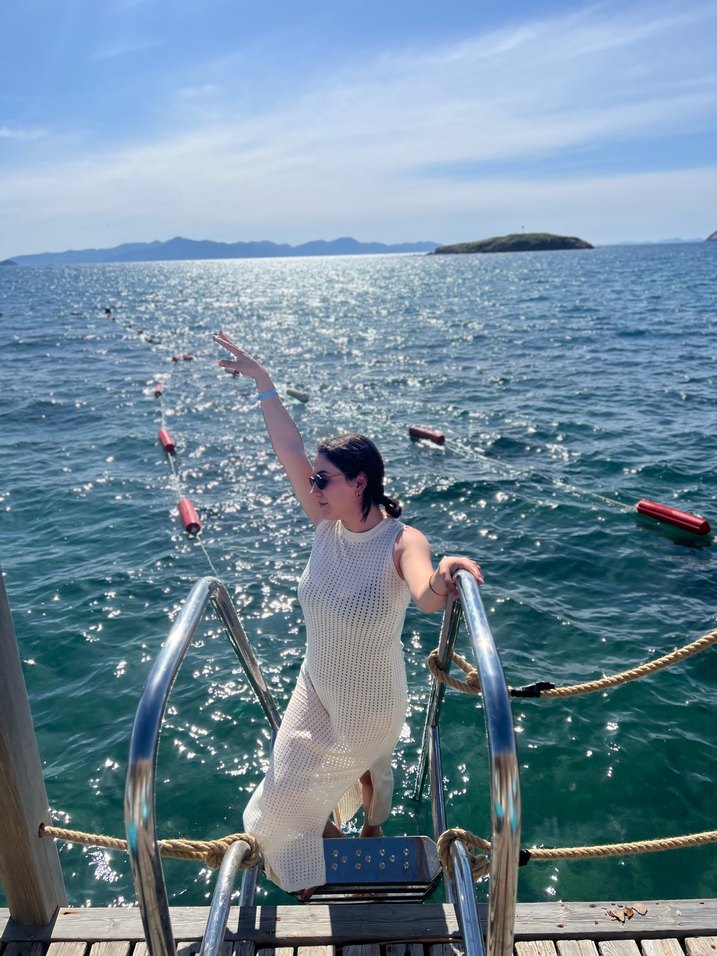 Kırık beyaz bikini üstüne harika bir sahil elbisesi