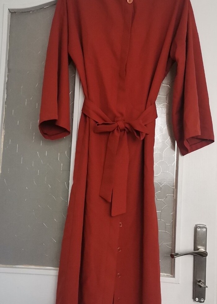 125 cm boyu kolları kimino tarzı bol olup seyyar kuşağı vardır hiçbir sorunu yoktur kaliteli kumaşı var rengi kiremit