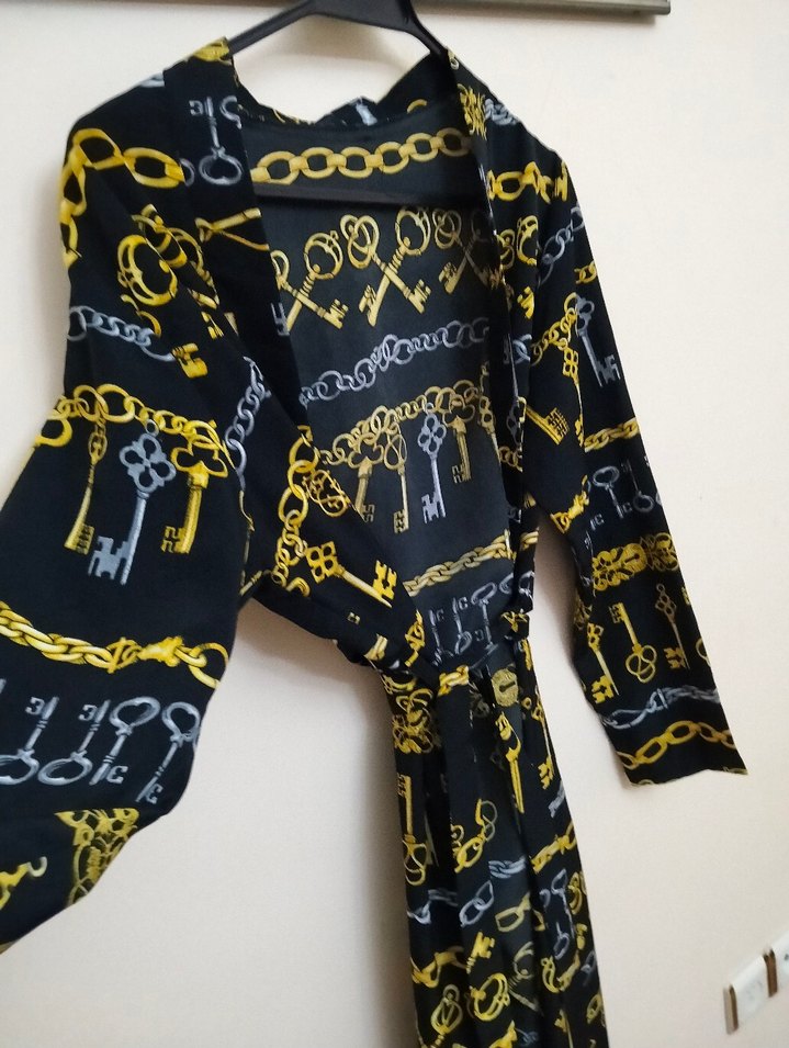 Uzun, bol kesim kadın kimono, ince askılı kollar ve altın-siyah zincir ve anahtar desenleriyle Parisian sokak modasını yansıtıyor. ✨Marka temsilidir.... 38-44 bedenler arası uygun şık zarif güzel bir kumaşa sahip tarz bir ürün.