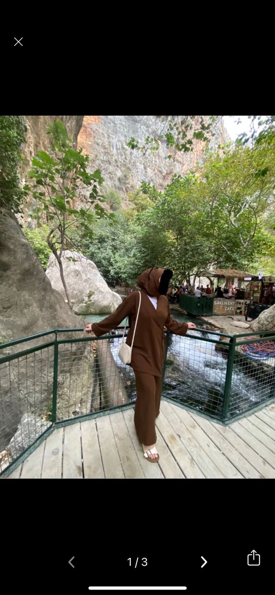 Kahverenkli, uzun boylu ve bol kesim kadın takım uzun kollu, yumuşak ve sıcak kumaştan, sokak stiline uygun.