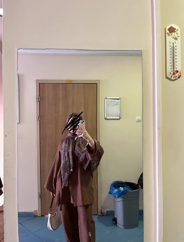 Salaş kesim, keten kumaştan yapılmış, yüksek yakalı ve uzun kollu kahverengi tie-dye desenli kadın takımı. Minimalist ve sade günlük kullanım için uygundur.