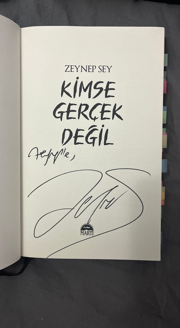 Zeynep Sey'in "Kimse Gerçek Değil" adlı romanı, Martı yayınevi tarafından basılmış ve imzalıdır.