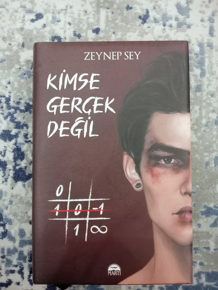Zeynep Sey'in "Kimse Gerçek Değil" adlı romanı, yaralı genç bir adamın çizimi ve üç taş oyunu figürüyle duygu ve kimlikleri sorguluyor.