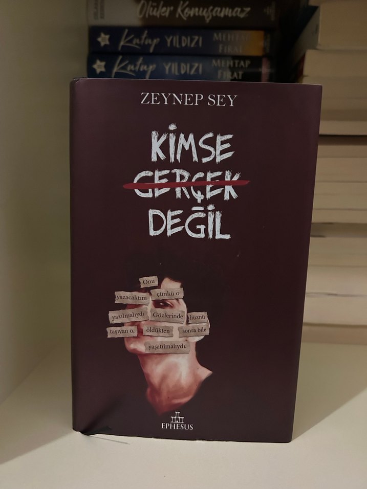 Zeynep Sey'in 'Kimse Gerçek Değil' adlı romanı, gerçeklik ve algı temalarını işliyor. Kapakta el illüstrasyonu ve katmanlı yazılar yer alıyor.