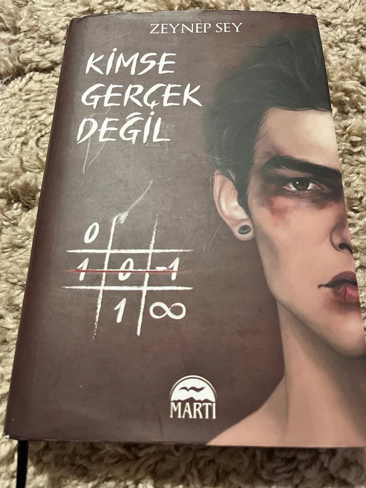 Zeynep Sey'in "Kimse Gerçek Değil" adlı romanı, Martı yayınlarından çıkmıştır. Kapağında sembolik işaretler ve etkileyici bir görsel yer alır.