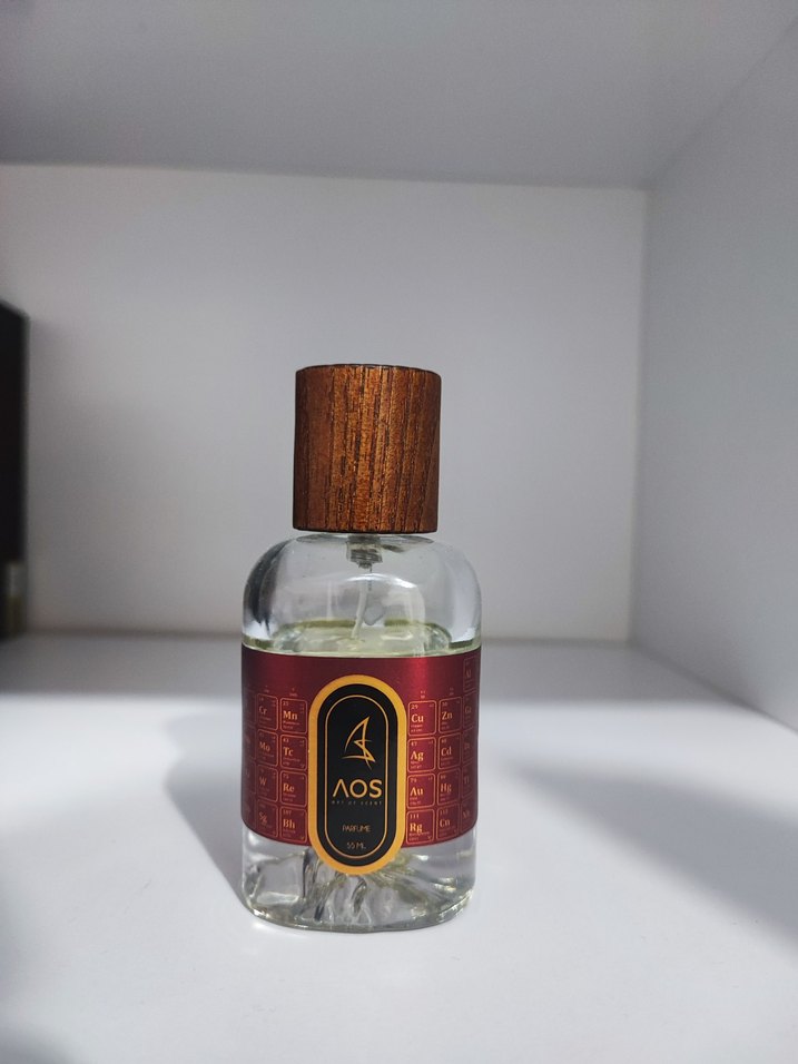 Ahşap kapaklı, bordo renkli parlak etiketli, minimalist tarzda erkek parfümü.