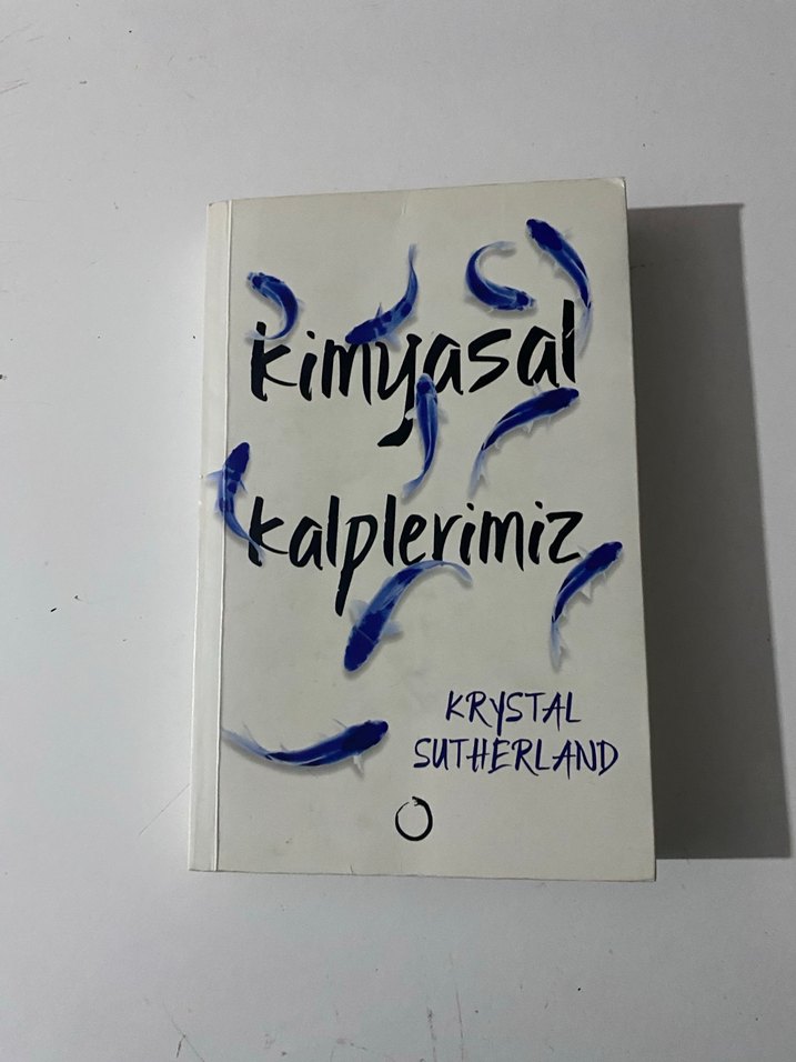 Krystal Sutherland imzalı "Kimyasal Kalplerimiz" adlı roman, karmaşık duygular ve ilişkileri konu alır. Beyaz kapakta mavi tüy benzeri çizimler bulunur.