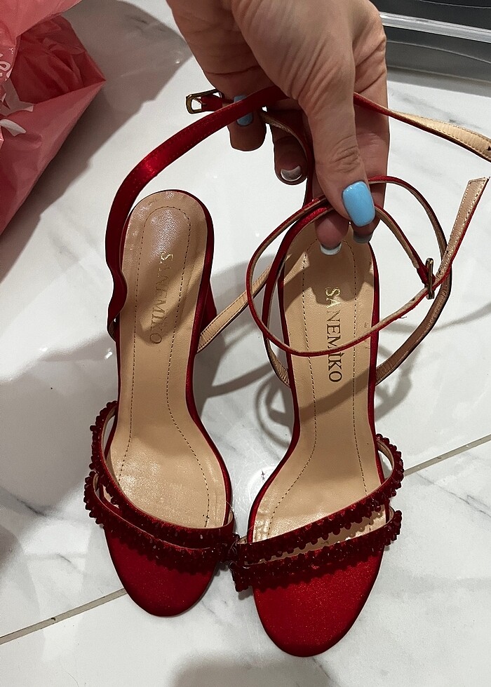 1 kez kınamda giydim, içi gerçek deri çok rahattı. Deformeleri fotoğrafta görüldüğü gibi, yapıştırılabilir. 38-39 uyumlu. Kırmızı renk. Yenisi 9.850 tl