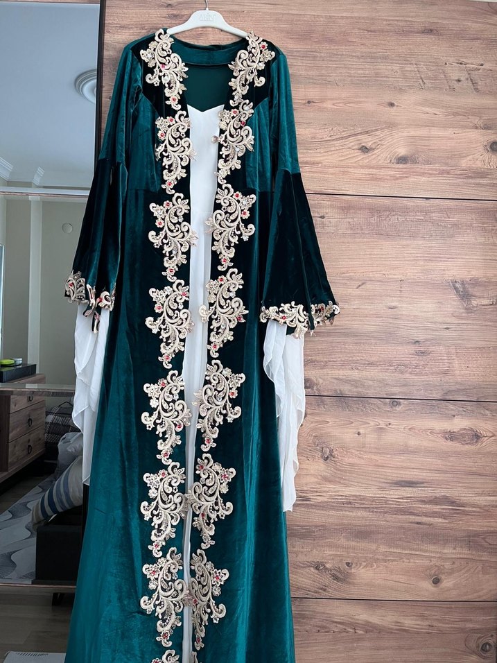 Kına Bindallı Kadınlar için uzun, bol kesim, uzun kollu ve straplez yaka işlemeli koyu turkuaz kına elbisesi. drapeli detaylara sahiptir.