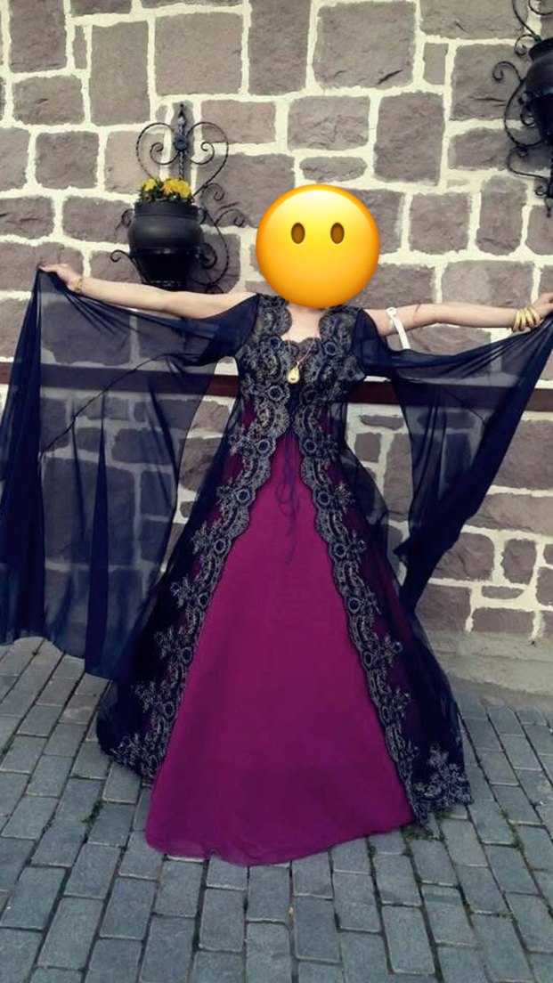 Kına gecesi 36-40 bedene kadar uyumlu için Fulya lacivert pelerinli Bindallı Mor straplez, uzun boylu ve drapeli kolları olan, desenli detaylarla süslenmiş dar kesim gotik elbise.