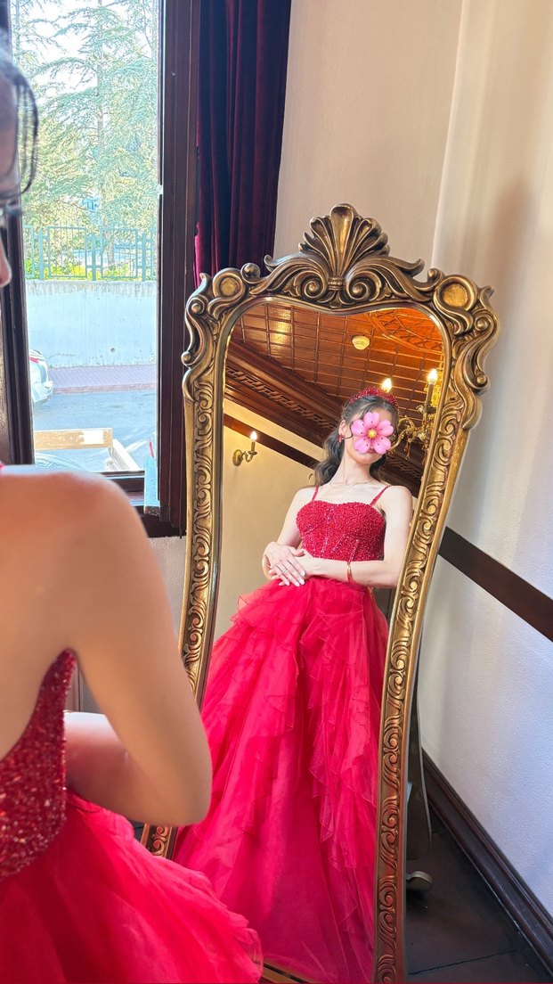 Işıltılı nakışlı, drapeli katmanlara sahip kırmızı, straplez, vücuda oturan uzun abiye. Modern klasik tarzda cesur bir düğün elbisesi. 165 boy 52 kilo ile giyildi arkası ipli ayarlama yapılabilir özel işleme abiye temiz, tarlatanı mevcut.