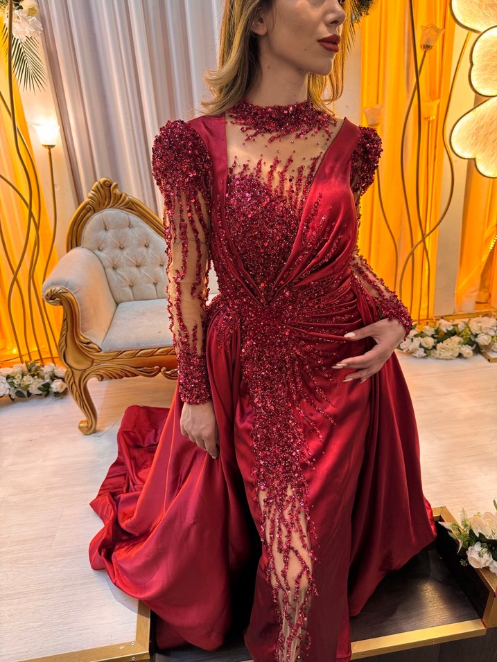 Kına elbise bordo Uzun Kollu V Yakalı Abiye Elbise