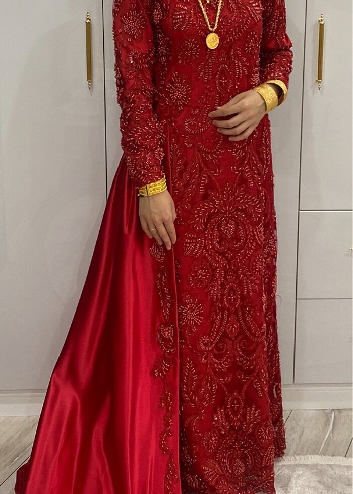 Ürünü kına gecemde giydim. Eşarbı ile gönderilecektir . Özel dikimdir. 34 beden uyumludur . Özel dantel boncuklu kuponla dikilmiştir astarlıdır yandan kuyruğunu vardır