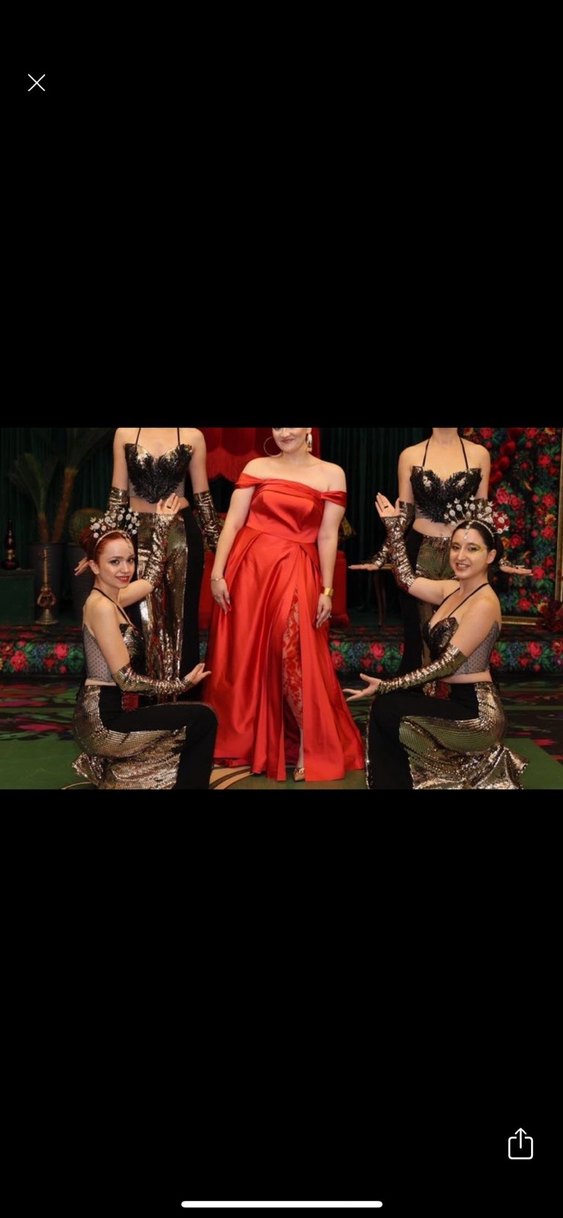 Drapeli detaylara ve etnik desenlere sahip, straplez yaka uzun kırmızı, vücuda oturan kadın abiye elbise, avant-garde parti tarzı için uygun. ÖZEL DİKİMDİR 40-42 beden için