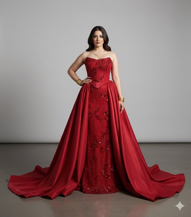 Kırmızı, straplez, drapeli uzun abiye elbise. Fitted kesim, baskılı detaylarla modern klasik ve gösterişli bir tasarım. Kolsuz ve şık. 34 36 38 40 beden uyumlu arkası ipli Ürün 1 kez kullanıldı satılık