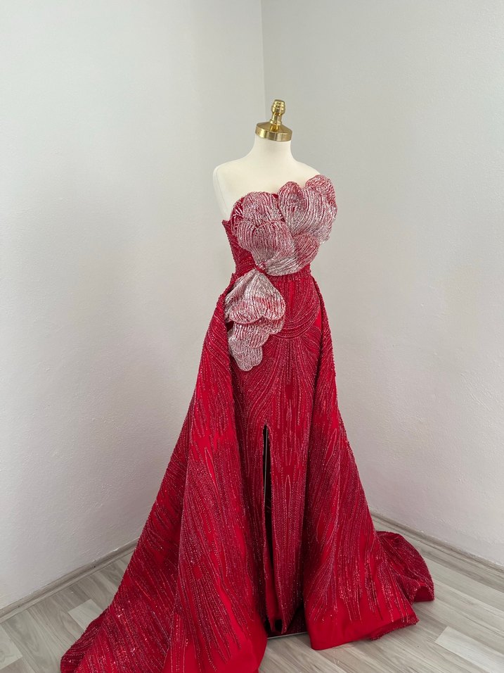 Uzun, kırmızı, straplez nişan elbisesi, drapeli ve nakışlı detaylara sahip. Parlak yüzeyi ve regular kesimi ile göz alıcı bir düğün kombini sunar.