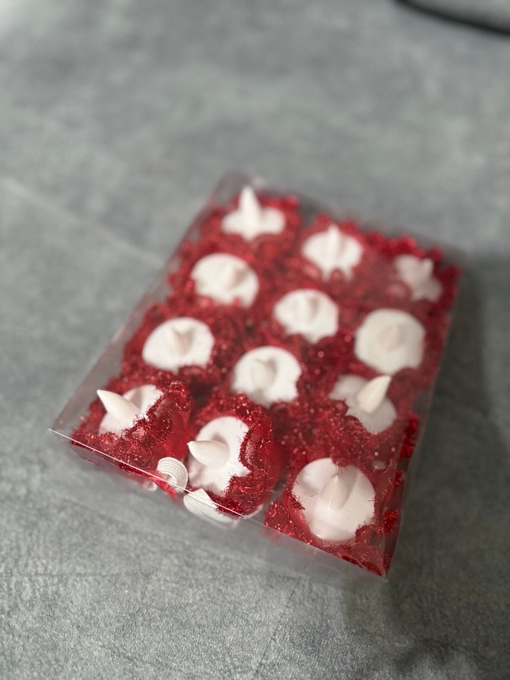 Beyaz üst kısmı ve kırmızı simli kenarları olan dekoratif mum. 12 adet kına için pilli led ışıklı mum