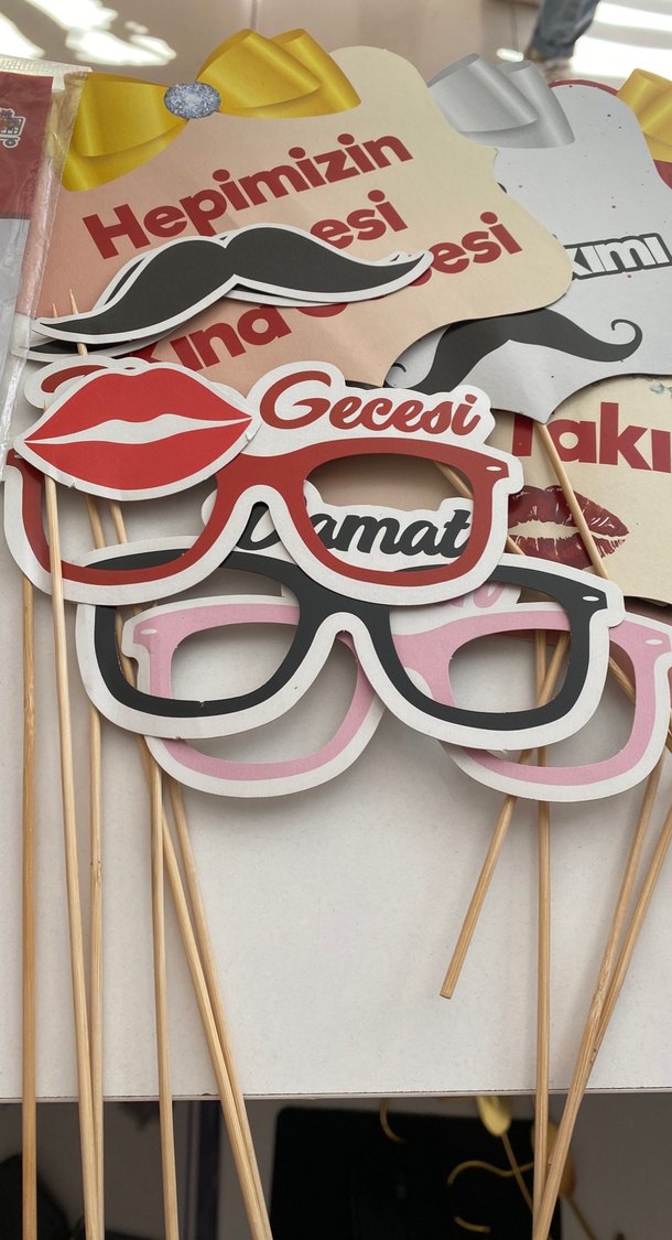 Kına gecesi için 12 adet koyu renkli konuşma balonu seti. Misafirlerin tutması için çeşitli yazılar ve süslemeler içerir.