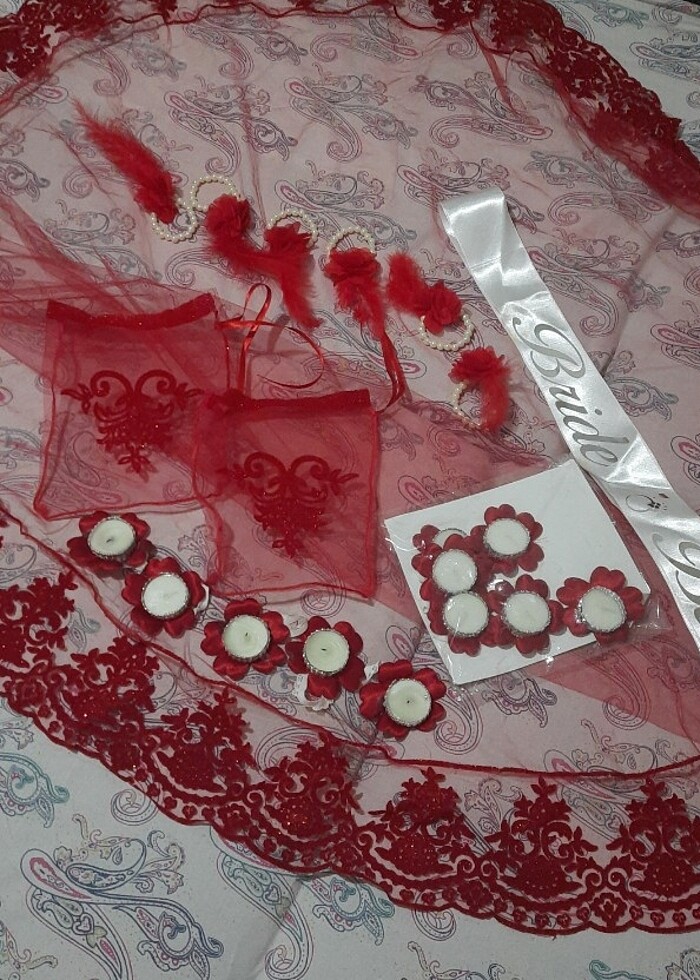 1 ad kina gecesi simli duvak 2 ad simli eldiven 1 ad bride to kuşak 11 adet kırmızı mum 11 ad el mumu 6 ad nedime bilekliği