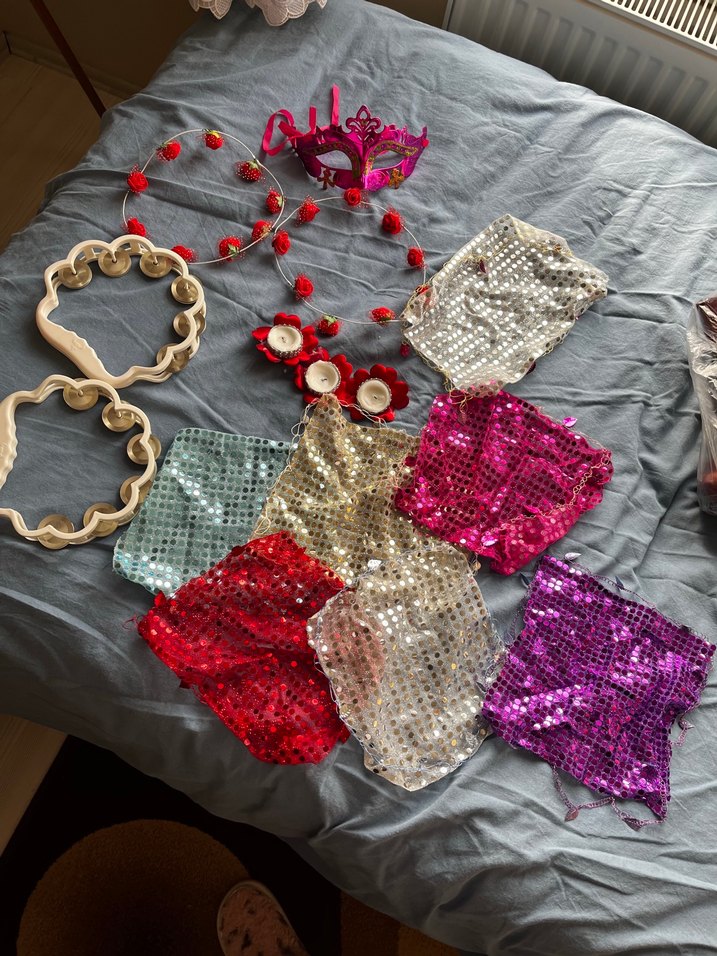 Fotoğrafta her şey net 7 mendil 2 çıngırak 2 taç 1 maske 3 kullanılmış mum
