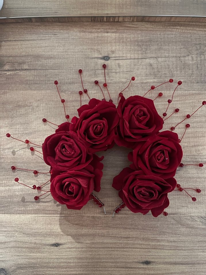 Bordo renkte, boncuk detaylı örme gül tasarımıyla vintage bohem tarzında kına tacı