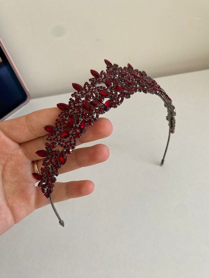 Bordo cam taşlarla süslenmiş, parlak Kına tacı. hiç kullanılmadı tesettürlü tesettürsüz kullanıma uygundur. Bordo renkli, cam taşlarla süslenmiş, parlak ve gotik tarzda şık saç aksesuarı.