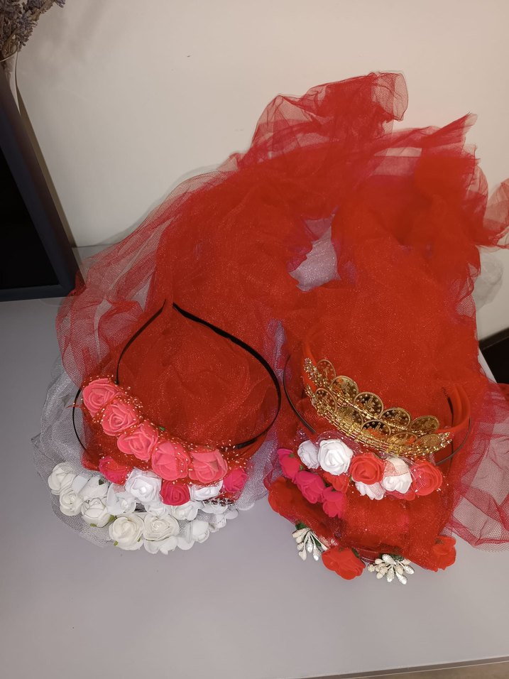 Kırmızı fırfırlı, renkli çiçek desenli çocuk taçları, küçük güller ve süslemelerle avant-garde bir tarz sunar.