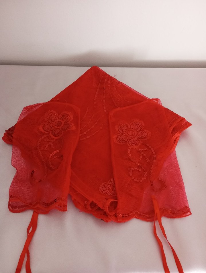 Kırmızı renkte, dantelli ve işlemeli kına takımı Canlı renkleriyle öne çıkanlar da. Tülbenti ve eldivenleri ile beraber.