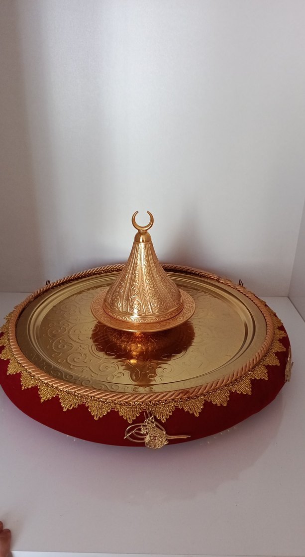 Parlak altın renkli ve işlemeli desenlere sahip geleneksel İşlemeli Altın Renkli KINA TEPSİSİ GELİN KUŞAĞI KİNA VE TAKI KUŞAĞI HEDİYE