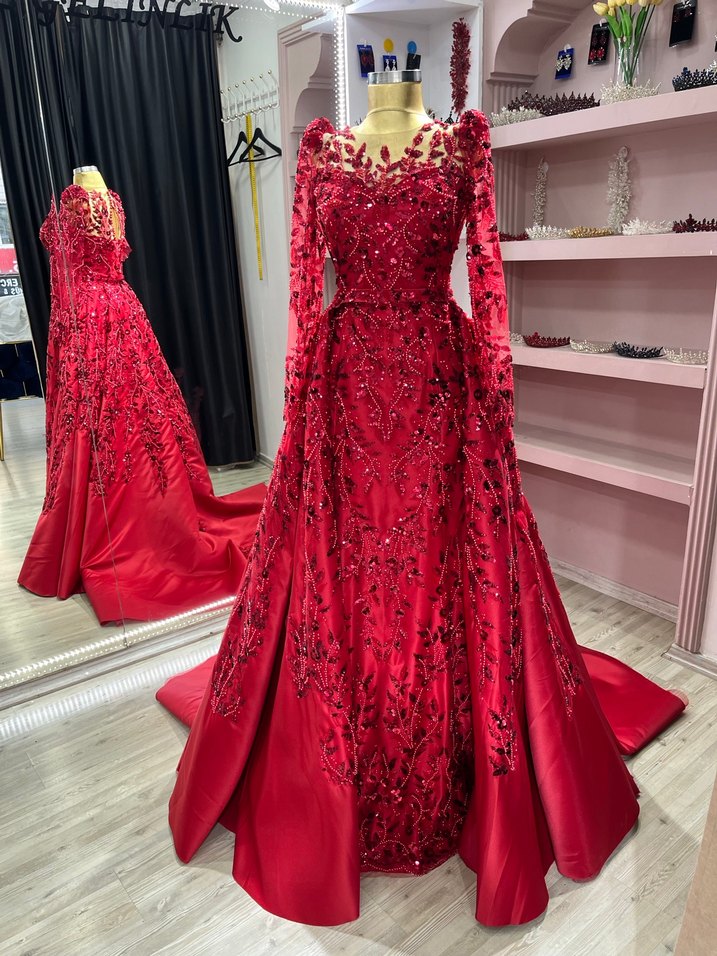 Uzun kollu, boncuk işlemeli kırmızı abiye elbise, tekne yaka ve desenli detaylara sahiptir. Düğünler için parlak ve klasik bir tercihtir.