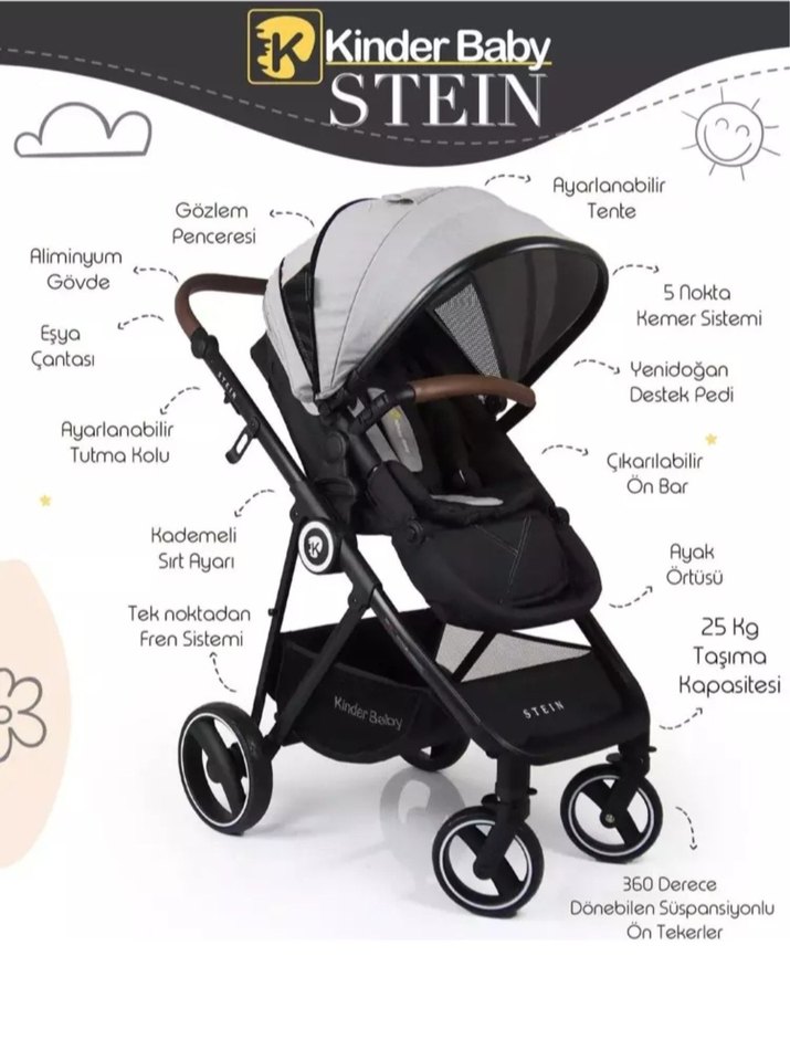 Kinder Baby Stein bebek arabası, ayarlanabilir tente, alüminyum gövde ve 25 kg taşıma kapasitesine sahiptir. 5 noktalı kemer, çıkarılabilir ön bar, ayarlanabilir sırt ayarı ve gözlem penceresi bulunur. Eşya çantası, ayarlanabilir tutma kolu, ayak örtüsü ve 360 derece dönebilen ön tekerleklerle donatılmıştır. Tek noktadan fren sistemi mevcuttur. çift yönlüdür cok sağlam ve dayanıklı bir bebek arabasıdır ön tutma(deri kısmı) yerinde bi kaç parça kesilmiş kızım kendi kesmiş :)) onun dışında hiç bir problemi yoktur az kullanıldı