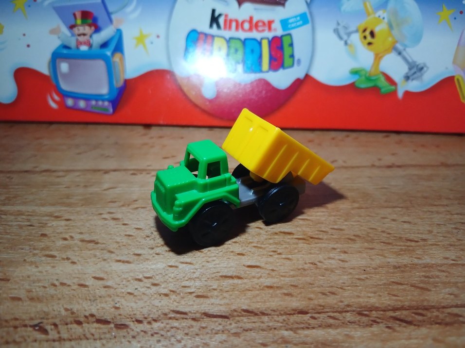 Yeşil kabin ve sarı damperli renkli oyuncak kamyon. Üzerinde 'Kinder' yazısı bulunur.