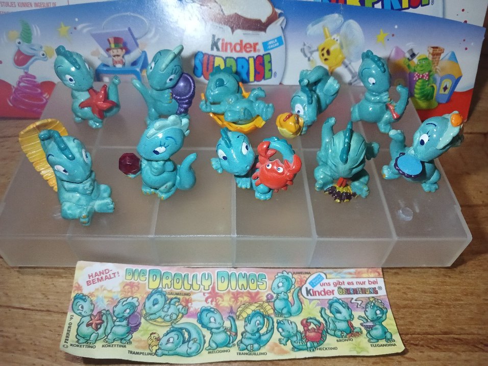 Kinder Surprise'ın renkli turkuaz Dolly Dinos aksiyon figürleri, canlı detaylara sahip eğlenceli dinozor karakterleri içerir.