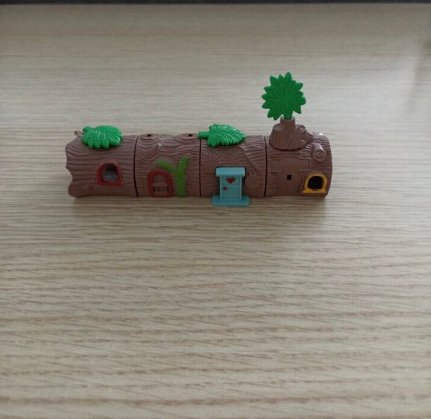 Küçük kapılı ve yeşil yaprak detaylı, sert plastikten yapılmış renkli kahverengi ağaç ev figür oyuncak. Küçük eksikleri vardır