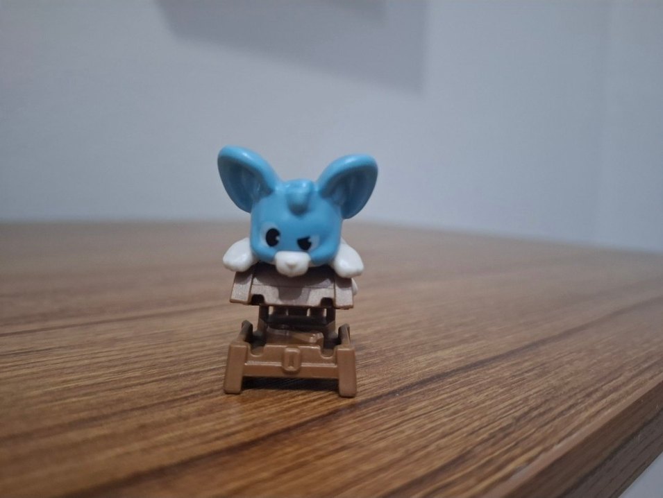 Büyük kulaklı, beyaz burunlu pastel mavi küçük aksiyon figürü, kahverengi bir taban üzerinde duruyor. Sevimli ve oyuncu görünüyor.