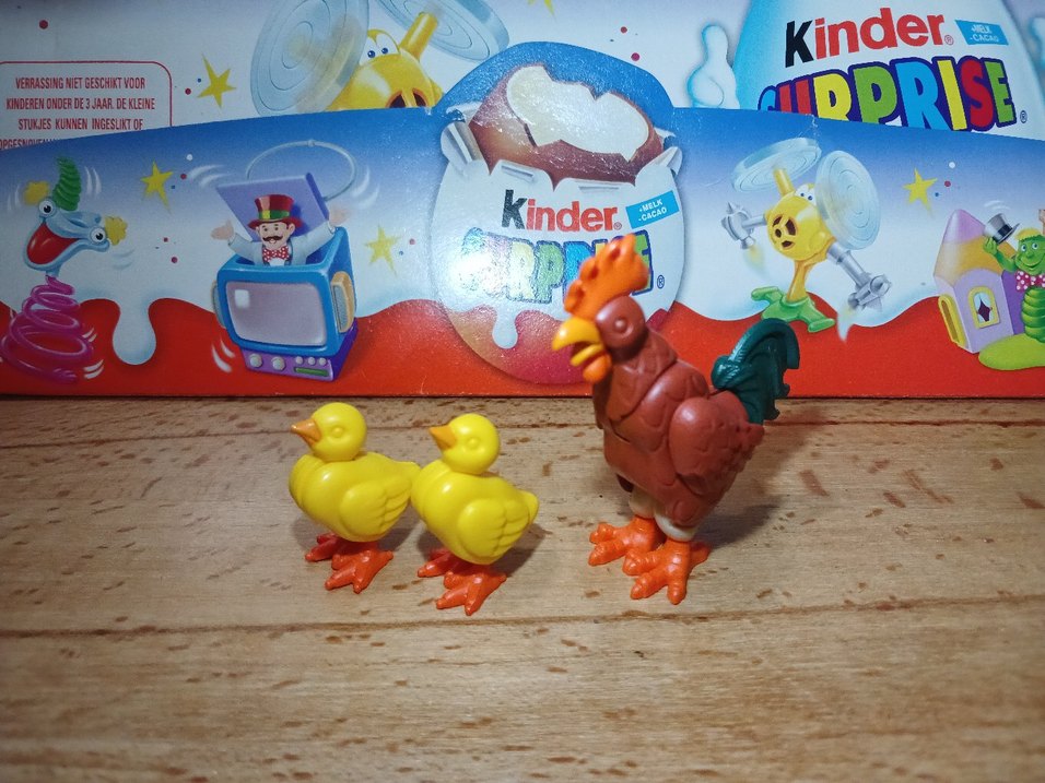 Kinder markasına ait renkli kahverengi tavuk ve sarı civciv figürleri. Küçük ve detaylı oyuncaklar.