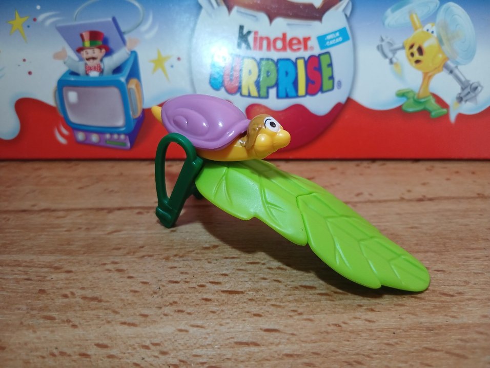 Mor kabuklu kaplumbağa figürlü, yeşil yaprak tabanlı renkli Kinder itmeli oyuncak.